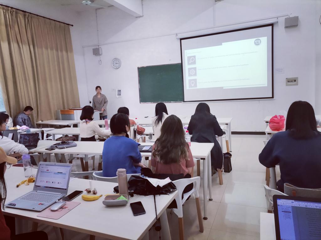 4月29日下午,由外国语学院2020级MTI专业学生承办的第五届“译之道”(TransTao)翻译沙龙暨“学术英语大赛”选拔赛在外国语学院104教室召开,18名20级MTI专业学生参加此次沙龙暨选拔赛,本次沙龙邀请到陆秀英、肖群、刘庆雪、樊梦等导师到现场观摩指导。