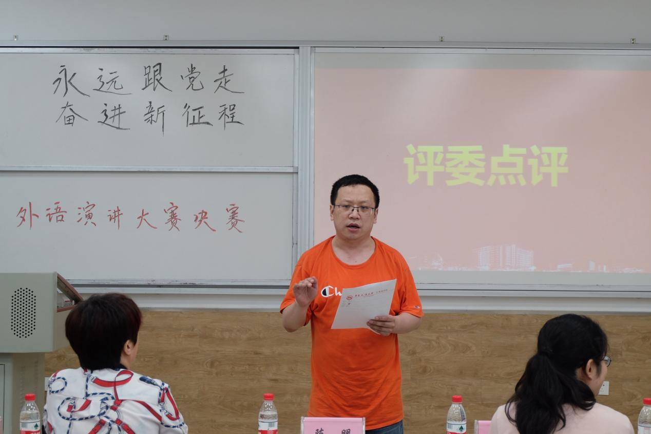 此次比赛邀请学院党员专任教师陈明、李宗、王敏、刘星、舒星等五位老师担任评委,校团委书记罗伟、教务处副处长王传云、外国语学院党委副书记光辉出席决赛,MTI教工党支部书记杨明、院党委组织员郑伟一同观看比赛,比赛由杨佳涛、王静主持。