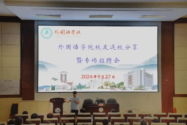 9月27日下午,外国语学院校友返校分享暨专场招聘会于图书馆202教室举行,由优秀毕业生胡文涛分享汇报,外国语学院院长陆秀英、院党委书记薛先庆、党委副书记光辉、学工办负责人郑伟、辅导员钟雪倩及2025届毕业生和2022级学生代表参加会议。