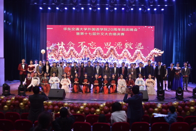当晚,“廿念不忘 思源致远”二十周年院庆晚会暨外文大合唱决赛在南区礼堂成功举办。校党委书记万明、党委副书记肖长春出席并分别颁发“天佑杯”英语系列赛事特等奖和优秀组织奖。