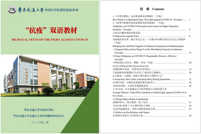 唐斌教授在《应用翻译》课堂里,将培养学生专业能力和疫情知识的学习普及结合起来,组织同学们搜集“抗疫”双语素材,并编辑为“抗疫”课程思政双语教材,让全校学生在学习疫情双语表达的同时,培养学生家国情怀和国际视野。该“抗疫”双语教材还作为外国语学院学生“线上云晨读”的规定诵读材料。