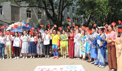 5月23日,以“多彩世界,大美中国”为主题的外院第十八届“红五月”英语文化艺术节于南区一食堂门口及学思路隆重举行。校党委委员、党委副书记肖长春,外国语学院院长唐斌,院党委书记程其胜,校党委组织部副部长兼学工部副部长李雪峰,校团委副书记张剑锋,校创新创业中心主任、校团委副书记师星,校党委学工部(处)副部(处)长王冰雪,外国语学院副院长周丽萍、单伟红、袁平华出席开幕式,各班级学业导师、辅导员和部分外教一同参加,开幕式由外国语学院党委副书记王朗主持。