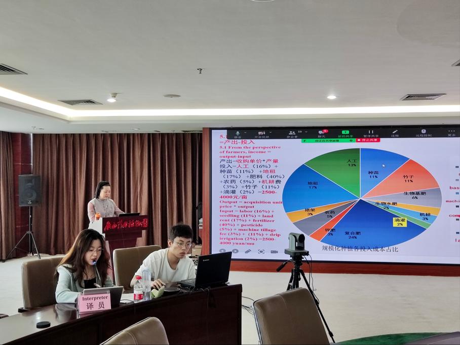 的金烟雨同学负责主题为葛根种植加工技术培训的口译服务。培训内容主要分为九大板块,葛根的价值 、国内外葛根应用概况、葛根种质资源分布、葛根高产优质栽培技术、葛根种植成本、葛根加工概况、葛根产业存在问题、葛根产业发展对策和葛根育种研究。参与培训的学生在线积极提问,授课老师在译员的帮助下一一做出解答。 此次口译任务专业性较强,金烟雨同学提前参与ppt等文档翻译,做了充分的译前准备,顺利完成了口译任务。