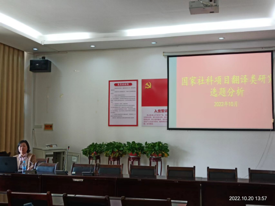 副院长陆秀英教授和研究所成员夏党华老师在学院102会议室进行了了关于国家社科翻译类研究选题分析的分享。本次学术沙龙由 副院长、翻译研究所所长陆秀英教授主持。