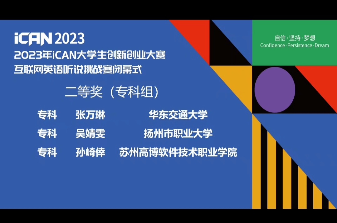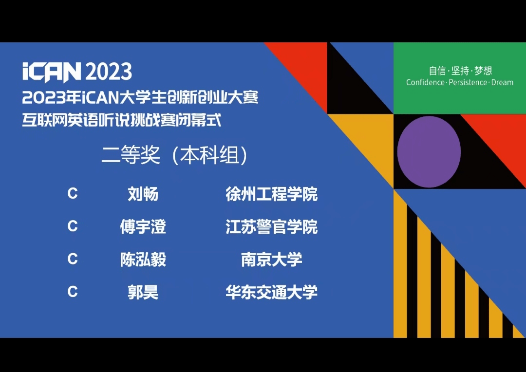 2023年11月19日,iCAN大学生创新创业大赛互联网英语听说挑战赛全国总决赛在东南大学隆重举行,11月26日大赛闭幕式在线上举行。本次全国总决赛有来自全国不同院校的200多名参赛选手。我校学子在竞争激烈的国赛中脱颖而出,4名同学获得国家二等奖。他们分别是来自外语学院的廖晓咏和郭昊,交通运输学院的伍昊嵩以及进贤校区轨道交通职业技术学院的张万琳。
