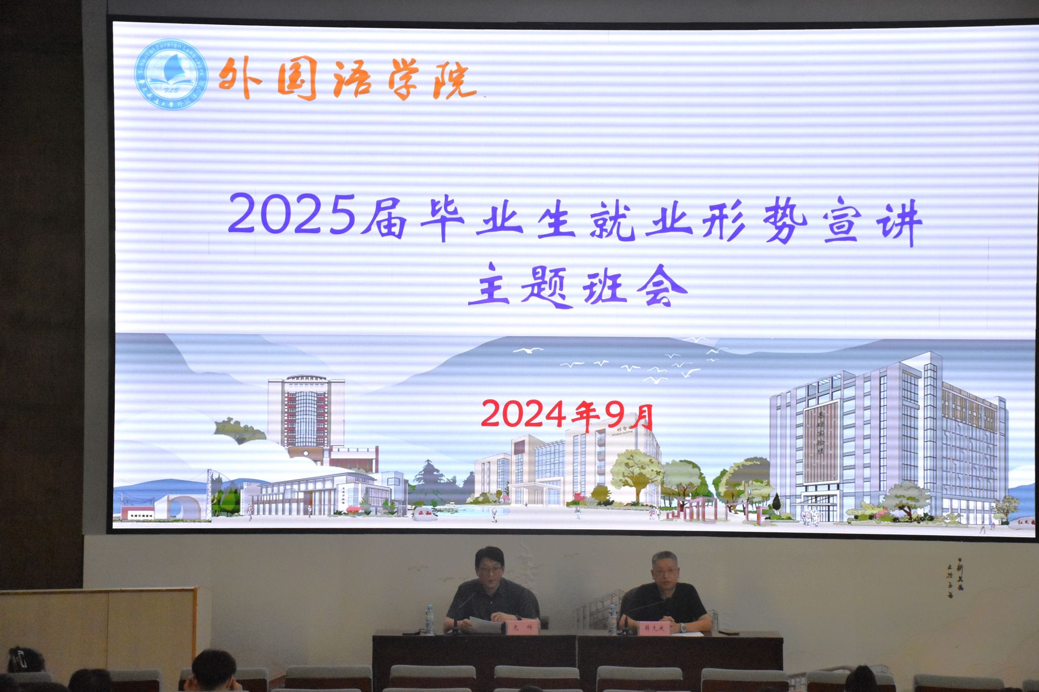 为进一步帮助学生把握就业形势,明晰职业规划,确定职业目标,找准努力方向,9月4日16:30,外国语学院于南区图书馆202召开“2025届毕业生就业形势宣讲”主题班会。本次班会由院党委书记薛先庆主讲,党委副书记光辉、学工办负责人郑伟、2025届毕业生辅导员钟雪倩、王伟峰出席,2025届毕业生及2026届全体同学参加此次会议,本次会议由党委副书记光辉主持。