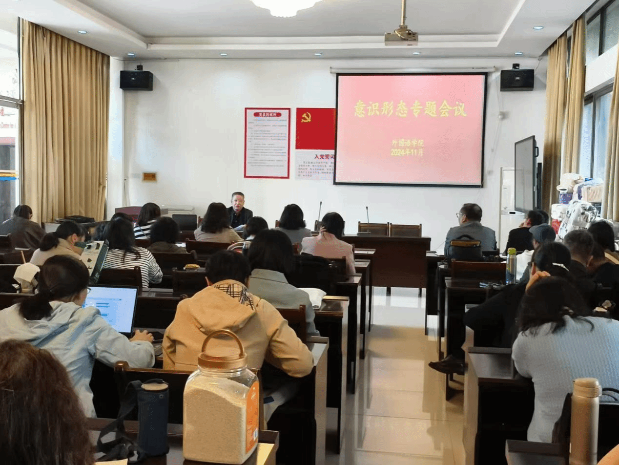 为加强意识形态工作,提升教师思想政治素质,外国语学院于11月7日下午召开了2024年意识形态专题会议。本次会议由院党委书记薛先庆主持并讲话,其他院领导和学院全体教职工出席会议。