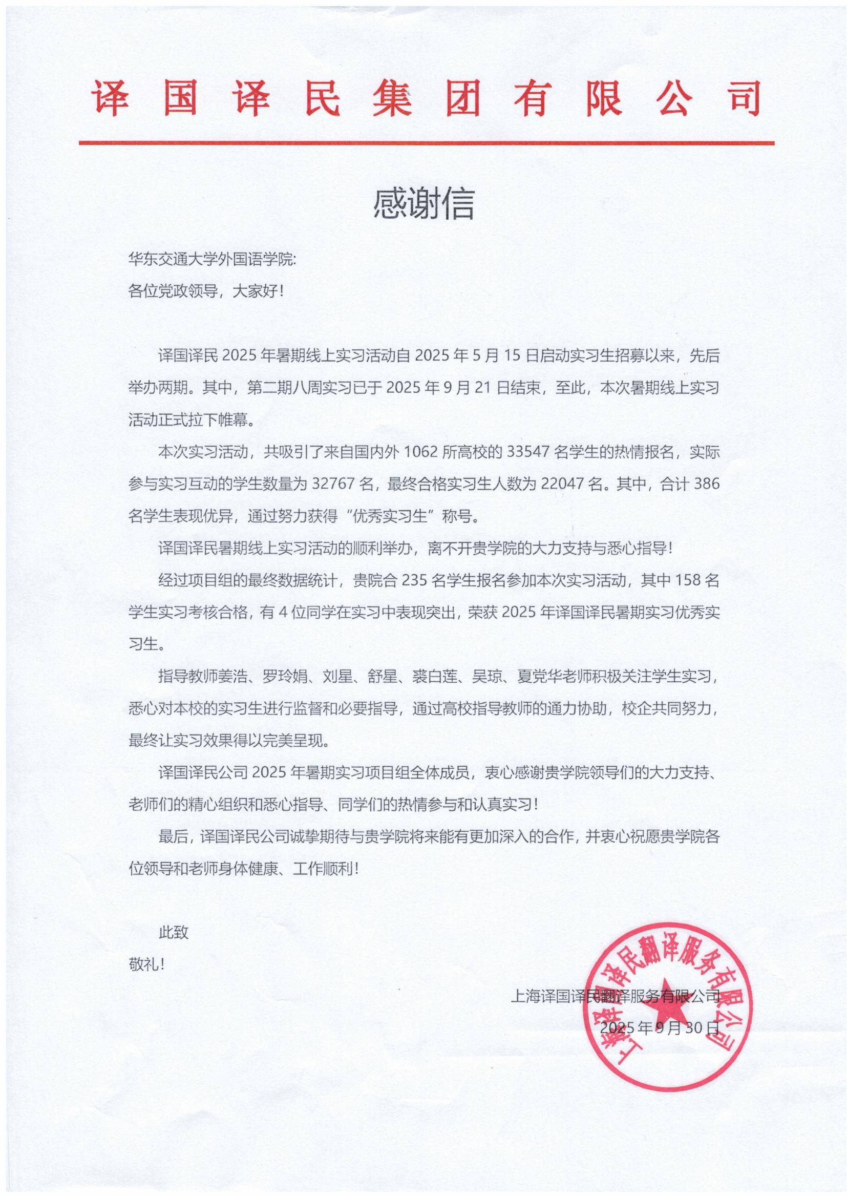 为进一步提升学生实践能力与综合竞争力,外国语学院联合上海译国译民翻译服务有限公司,成功举办了“2025暑期公益线上外语实习实践”。该项目为学生提供了接触前沿翻译技术与行业实践的宝贵机会,旨在帮助学生准确认识AI技术的工具属性,掌握智能时代语言服务新技能,深化对现代语言行业的认知,有效弥合在校学习与行业实践间的差距。