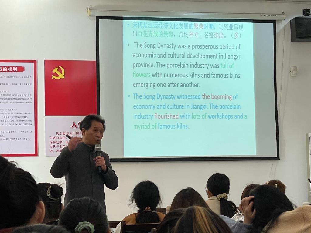 11月23日上午,景德镇陶瓷大学外国语学院教授、硕士生导师余孝平应邀莅临我院讲学,于教15栋102报告厅为我院翻译专业本科生及翻译硕士研究生带来“江西古代陶瓷文化翻译解析”专题讲座。讲座由外国语学院院长唐斌主持。