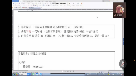 首先,20级MTI金烟雨同学从笔译出发,提醒同学们在考试过程中注意漏译、避免依赖字典、做好时间分配等问题,强调考前错题总结大于盲目刷题,并根据汉译英、英译汉两大板块向同学们推荐了备考资料。