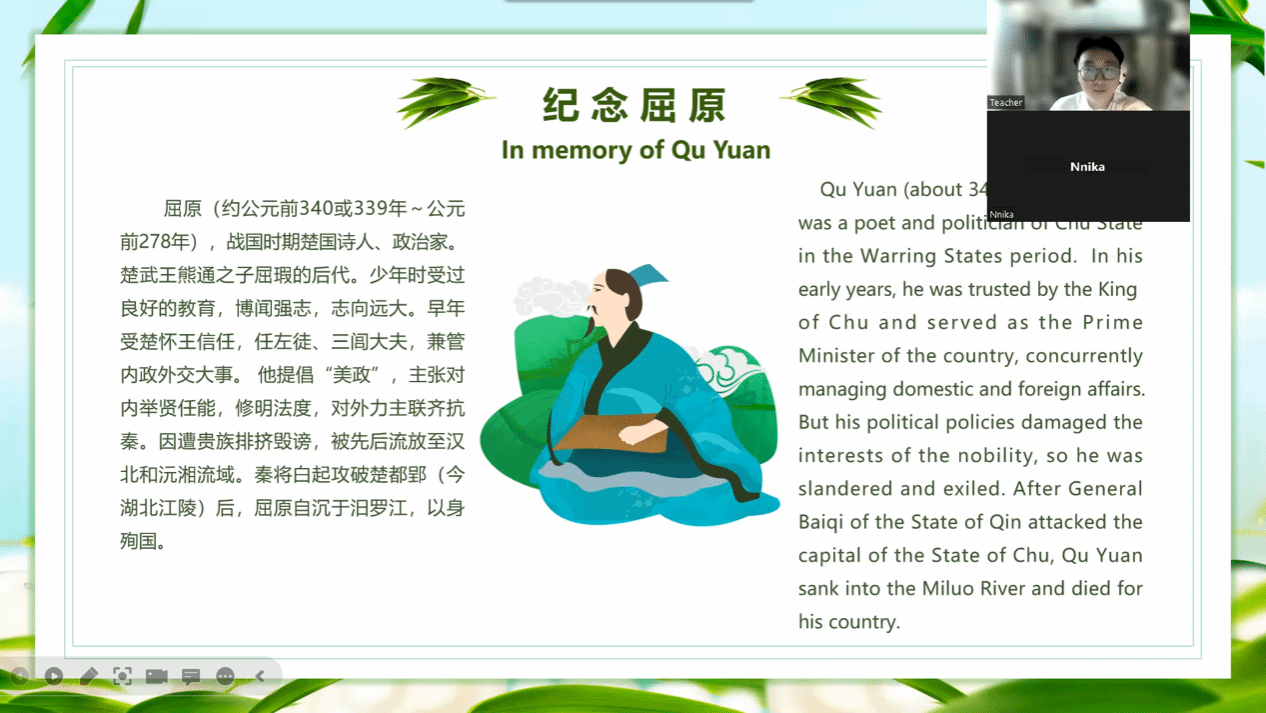 传播中国文化是我报名这次项目的初衷,因此在教学过程中我十分重视对中华文化背景与拓展知识的讲解。例如临近端午的那节课,我在课堂上与学生分享了端午节的相关知识,通过图片和视频的形式让学生们了解了这个节日的传统习俗;还通过讲述屈原的故事,让学生们更好地理解了中国古代的历史和文化;最后通过趣味答题的形式使端午节的知识深刻的印在了学生的脑海中。