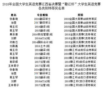 在5月21日结束的2018年全国大学生英语竞赛江西赛决赛暨“赣江杯”大学生英语竞赛中,我校选手发挥出色,多点开花,共计获得各组别和各奖项的特等奖18个,数量达历年之最。其中,在AB组(研究生、英语专业本专科组)组别中,我校外国语学院学子梅玉欣、蒋玉琴的综合、听力以及口语三项成绩综合排名位列该组第一、二名,表现出不俗的实力。另外我校选手还获得11个一等奖,8个二等奖。我校选手总体表现优秀,获得1个团体二等奖,2个团体三等奖。在大赛设置的9个团体奖中,我校拿到了其中3项,充分展示了我校学子的英语综合能力和素质。