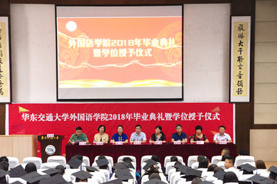 6月22日,外国语学院2018年毕业典礼暨学位授予仪式于南区图书馆202报告厅隆重举行。副校长张玉清、研工部部长程浩、我院院长唐斌、院党委书记程其胜、副院长周丽萍、单伟红、袁平华出席本次典礼。院学术委员会委员、全体辅导员、2018届毕业研究生、本科生以及家长代表、教师代表参加典礼,典礼由我院党委副书记王朗主持。