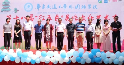5月23日,以“多彩世界,大美中国”为主题的外院第十八届“红五月”英语文化艺术节于南区一食堂门口及学思路隆重举行。校党委委员、党委副书记肖长春,外国语学院院长唐斌,院党委书记程其胜,校党委组织部副部长兼学工部副部长李雪峰,校团委副书记张剑锋,校创新创业中心主任、校团委副书记师星,校党委学工部(处)副部(处)长王冰雪,外国语学院副院长周丽萍、单伟红、袁平华出席开幕式,各班级学业导师、辅导员和部分外教一同参加,开幕式由外国语学院党委副书记王朗主持。