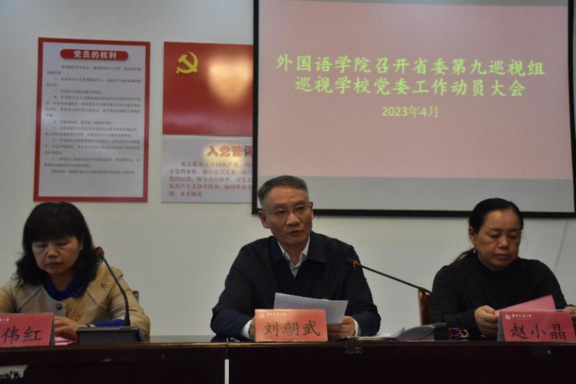 4月13日下午,外语学院组织全院教职工于博雅楼102会议室学习省委第九巡视组巡视华东交通大学党委工作动员会精神。此次会议由院党委书记刘朝武主持。