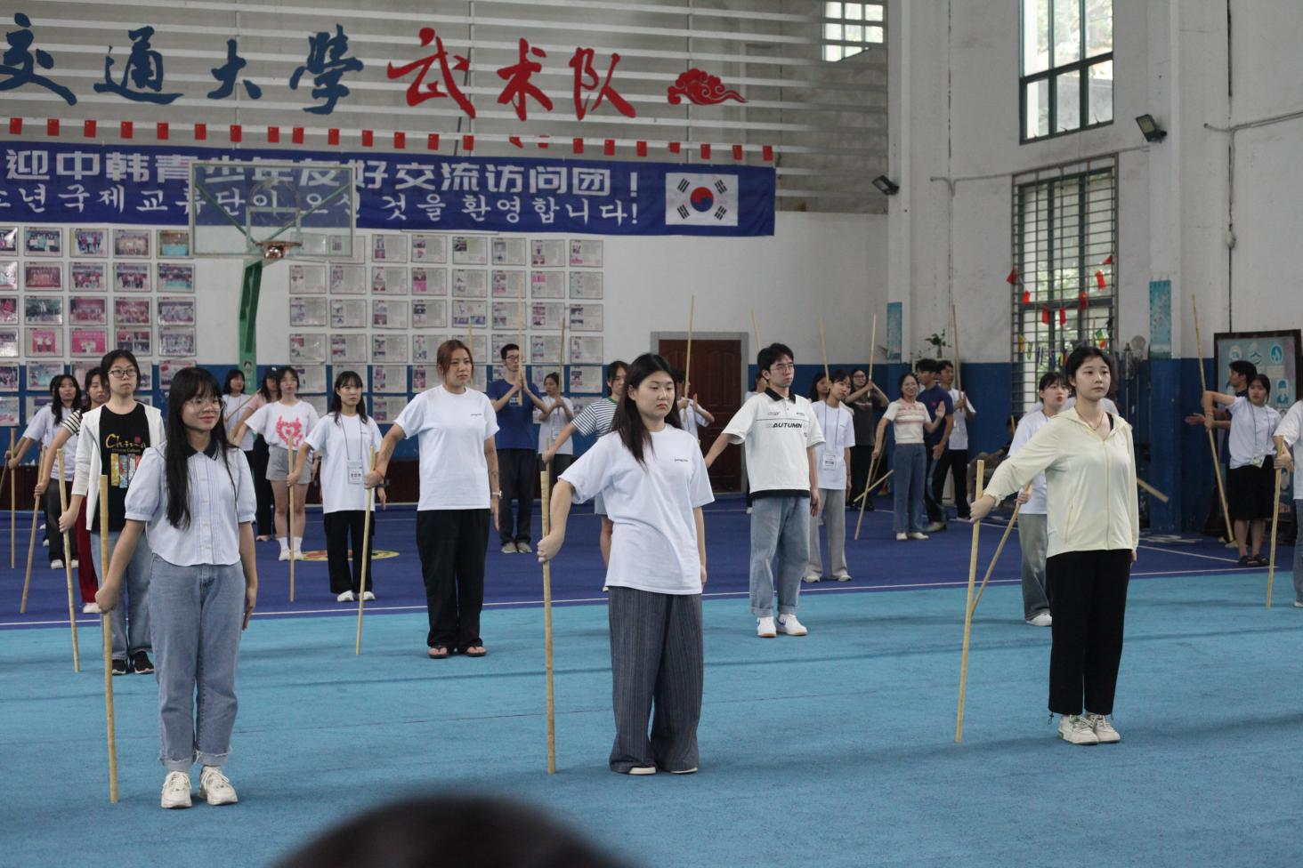 8月19日,欢迎仪式在我校南区举行,省外办副主任黄小燕、华东交通大学副校长黄志超出席并致辞,全罗南道希望人才育成课主务官曹恩泉代表发言。在观看完歌曲《眼、鼻、嘴》、武术表演《中华武魂》等文艺表演之后,志愿者们积极主动地与韩国结对学生结识交流。同学们从年龄,专业,爱好等各方面进一步了解对方,增进交流,谈笑之间拉近彼此的距离。