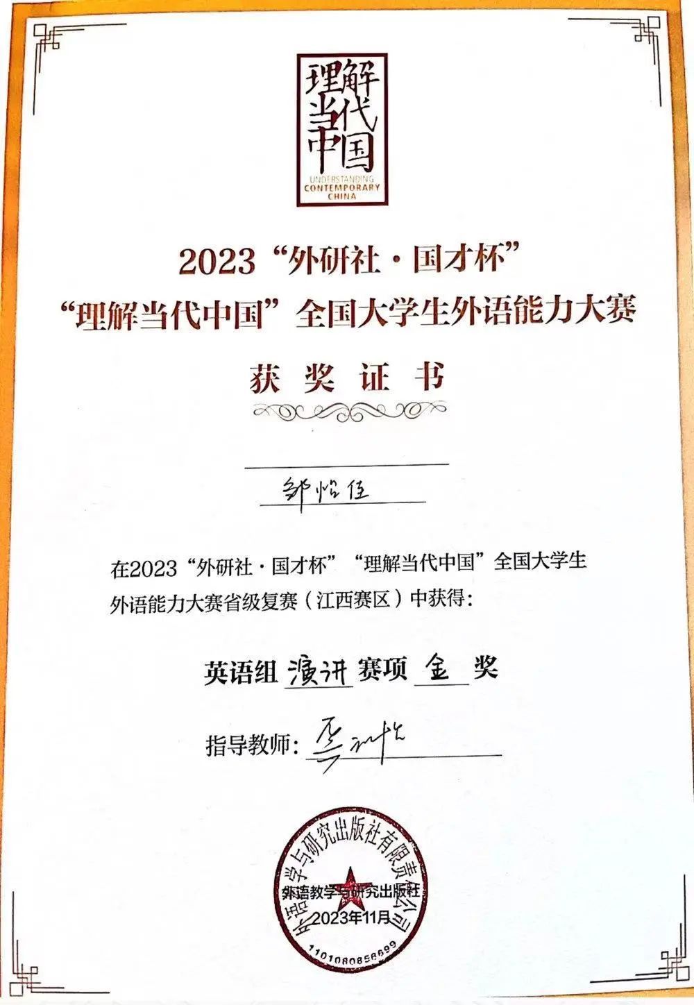 本次大赛,通过线上和线下两轮初赛的激烈角逐,我校共有9名学子荣获佳绩。22级翻译专业邹怡佳在演讲比赛中荣获金奖并成功晋级全国决赛,20级翻译专业邹啸堃在阅读比赛荣获金奖并成功晋级全国决赛。