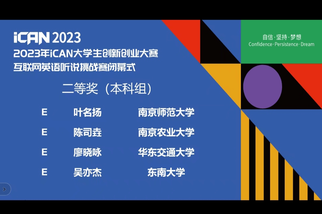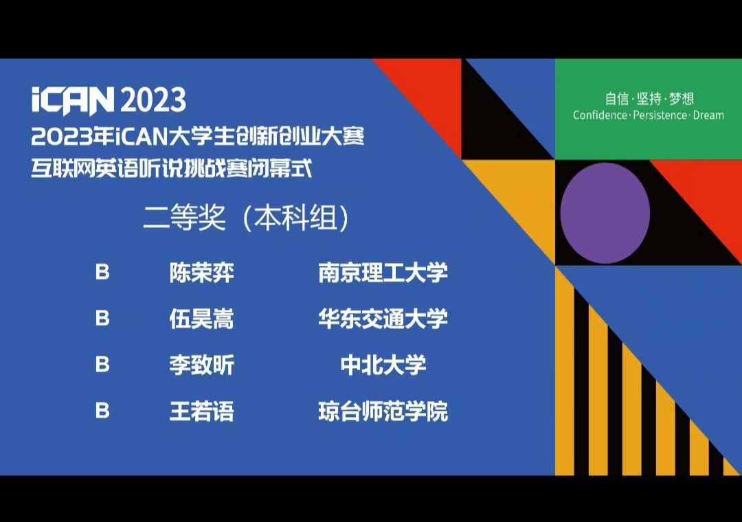 2023年11月19日,iCAN大学生创新创业大赛互联网英语听说挑战赛全国总决赛在东南大学隆重举行,11月26日大赛闭幕式在线上举行。本次全国总决赛有来自全国不同院校的200多名参赛选手。我校学子在竞争激烈的国赛中脱颖而出,4名同学获得国家二等奖。他们分别是来自外语学院的廖晓咏和郭昊,交通运输学院的伍昊嵩以及进贤校区轨道交通职业技术学院的张万琳。