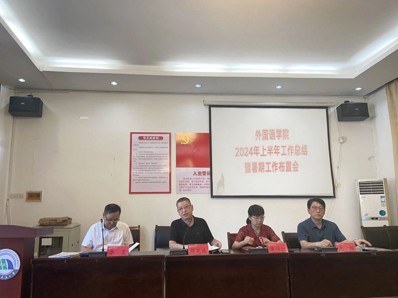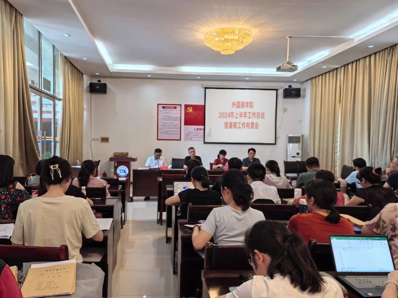 2024年7月4日下午2点,外国语学院于教15栋102会议室召开2024年上半年工作总结暨暑期工作布置会,外国语学院党委书记薛先庆、副院长单伟红、党委副书记光辉、副院长李星出席会议并发言,学院全体教职工参会。本次会议由党委书记薛先庆主持。