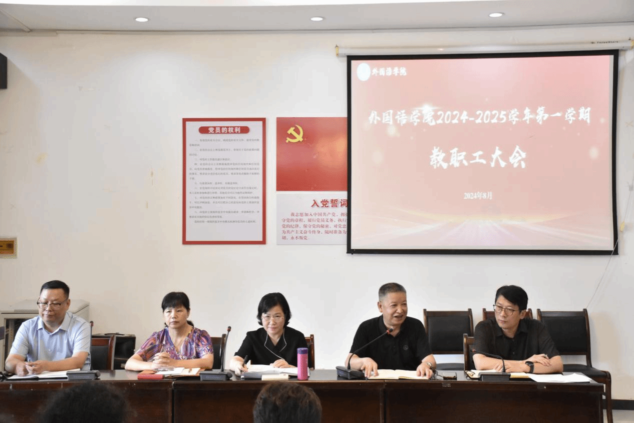 为进一步凝聚团队力量,确保开学各项工作有序、平稳、高效开展,引领全院教职工以崭新的面貌、饱满的精神迎接新学期,8月31日,外国语学院于教15栋102会议室召开了2024-2025学年第一学期教职工大会。党委书记薛先庆、院长陆秀英、副院长单伟红、党委副书记光辉、副院长李星及全体教职工参会。本次会议由党委书记薛先庆主持。