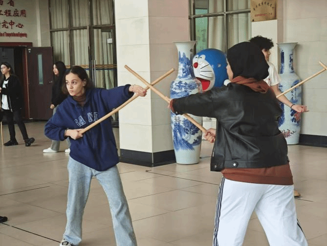 活动伊始,两位讲师以生动语言和丰富肢体动作,向留学生介绍武术短棍起源、发展与文化地位,讲解基本技巧、动作要领及实战运用,兼具知识性与趣味性。