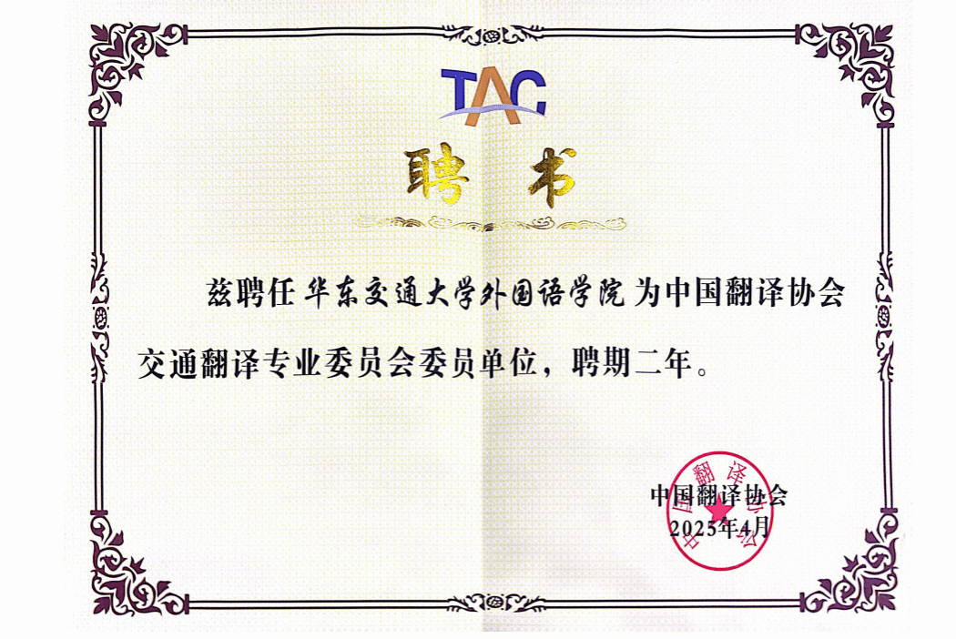 2025年4月24日,中国翻译协会“交通天下:人工智能时代的交通翻译与国际传播”年会专题交流会在大连举行,会上成立了中国翻译协会交通翻译专业委员会。我院当选为中国翻译协会交通翻译专业委员会委员单位,彭莉老师受聘为中国翻译协会交通翻译专业委员会委员。